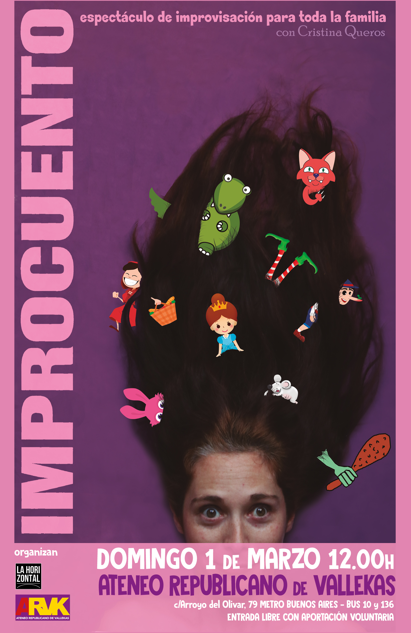Improcuento es un espectáculo para niños de 2 a 101 años; tal vez incluso niños un poco más mayores. Se los ve de todas esas edades entre el público, divirtiéndose a lo grande, es decir, a lo niño. Cuentistina es la maestra de ceremonias, la directora de las improvisaciones, la narradora y la anfitriona. Nos recibe a la entrada, nos invita a proponer personajes y títulos escribiéndolos en papelitos y depositándolos en unas urnas antes de entrar a la sala, luego nos acompaña a ella y nos expone el problema que se le ha presentado al borrárseles los cuentos, desapareciendo de sus páginas las historias, los personajes, los dibujos y colores. Pero también nos pide que la ayudemos a solucionarlo, creando nuevas historias, representándolas en el acto, para volver a poblar de maravillas esas hojas en blanco.