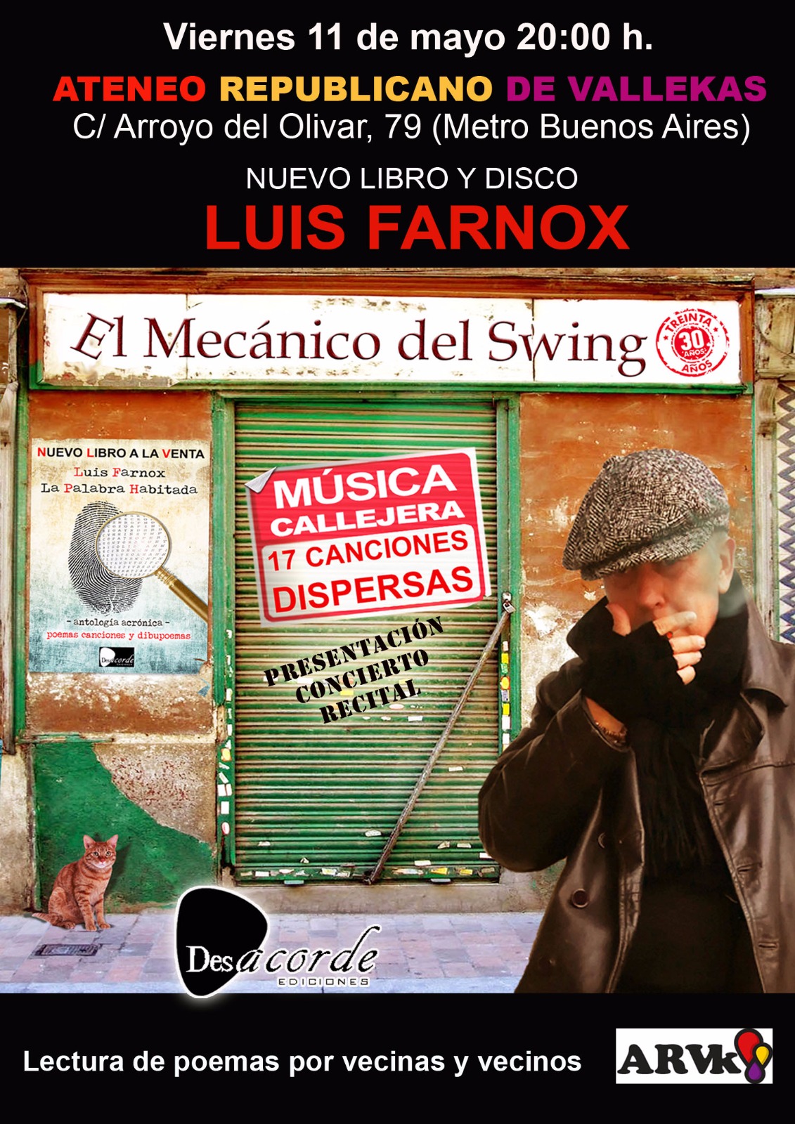 Un recital poético musical que recorre su trayectoria literaria y musical hasta la fecha. Poemas y canciones de sus nuevos trabajos: La Palabra habitada (Libro) y Música callejera (CD).