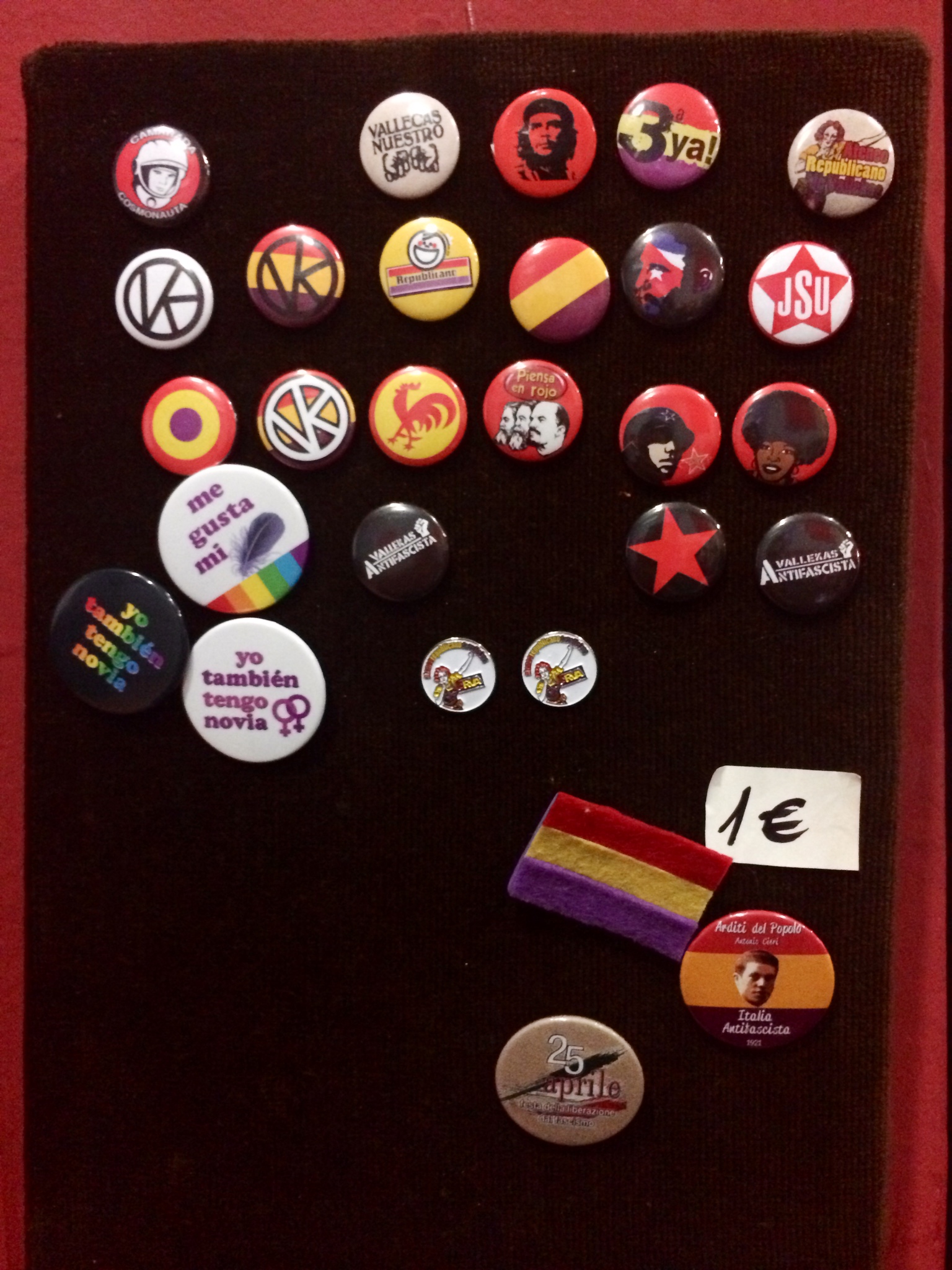 Pines de todo tipo: de la República Española, de Vallekas, del Ateneo Republicano de Vallekas, feministas, etc. Cada pin cuesta 1€